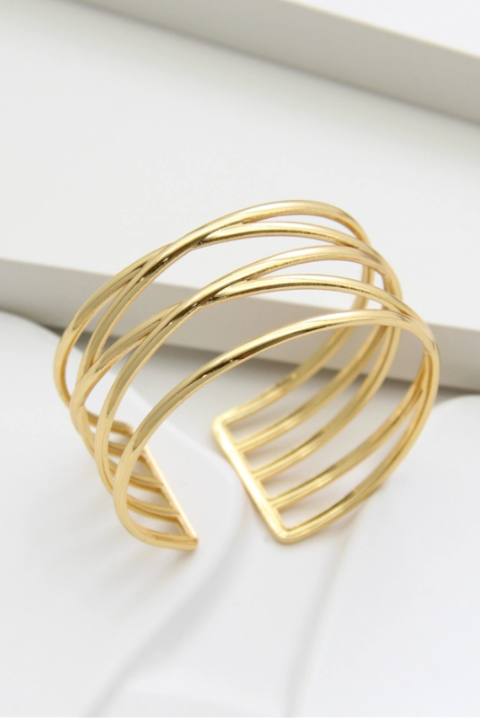 Sublimez votre poignet avec ce bracelet jonc ajustable en acier inoxydable doré, au design ouvert et structuré par plusieurs fines lignes entrelacées. Chic et intemporel, il apporte une touche de modernité et d’élégance à toutes vos tenues.