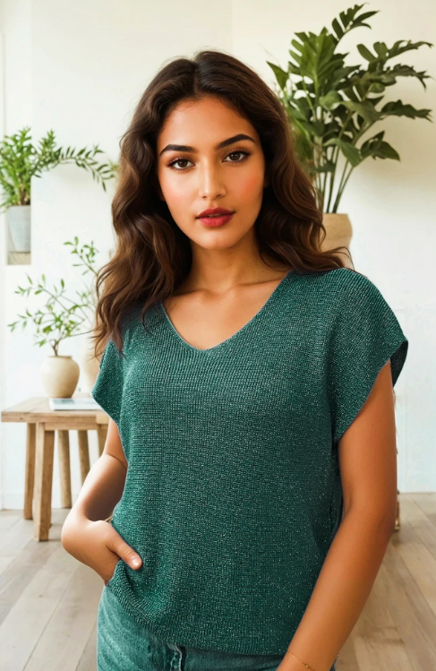 Top en fine maille avec lurex argenté. Le top conçu dans un tissu léger et frais, le rendant confortable à porter puisqu'il ne gratte pas. Fabriqué à partir de fils de lurex argenté, ce top a une brillance subtile et élégante. Le top a pour longueur 62 cm et tour de poitrine 100 cm